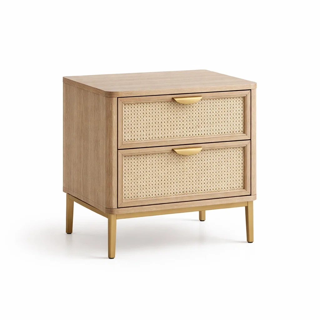 Matériaux : Structure en bois d'ingénierie, façades en rotin tressé, pieds en métal laqué