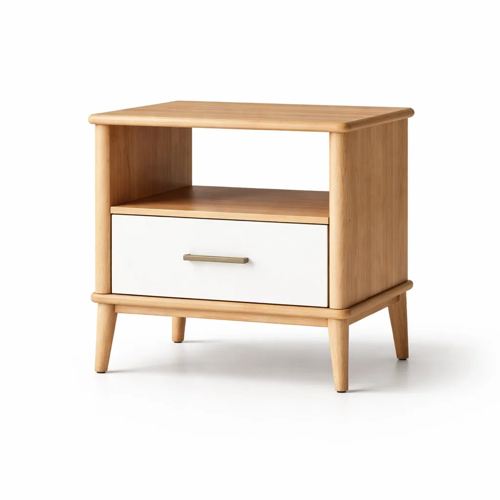 Table de chevet composée d'une structure en bois massif et d'un tiroir en MDF revêtu de peinture. Le tiroir et la tablette offrent un espace de rangement pratique.