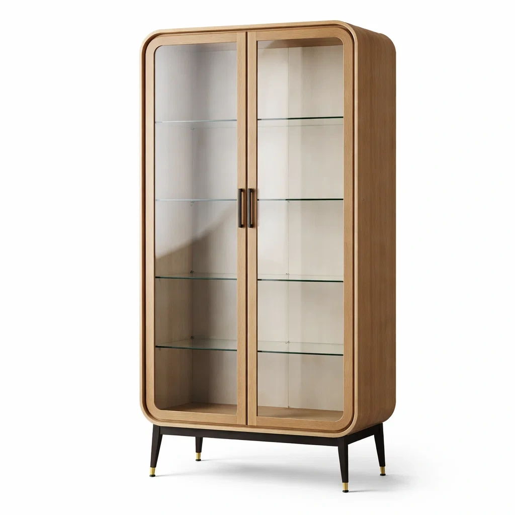 La vitrine est fabriquée en bois massif avec des portes et étagères en verre trempé de 5 mm d'épaisseur. Ses dimensions sont de 180 cm de hauteur, 80 cm de largeur et 40 cm de profondeur. Elle repose sur des pieds en métal et pèse 45 kg. La construction robuste permet un usage intérieur, avec quatre étagères spacieuses pour le rangement.